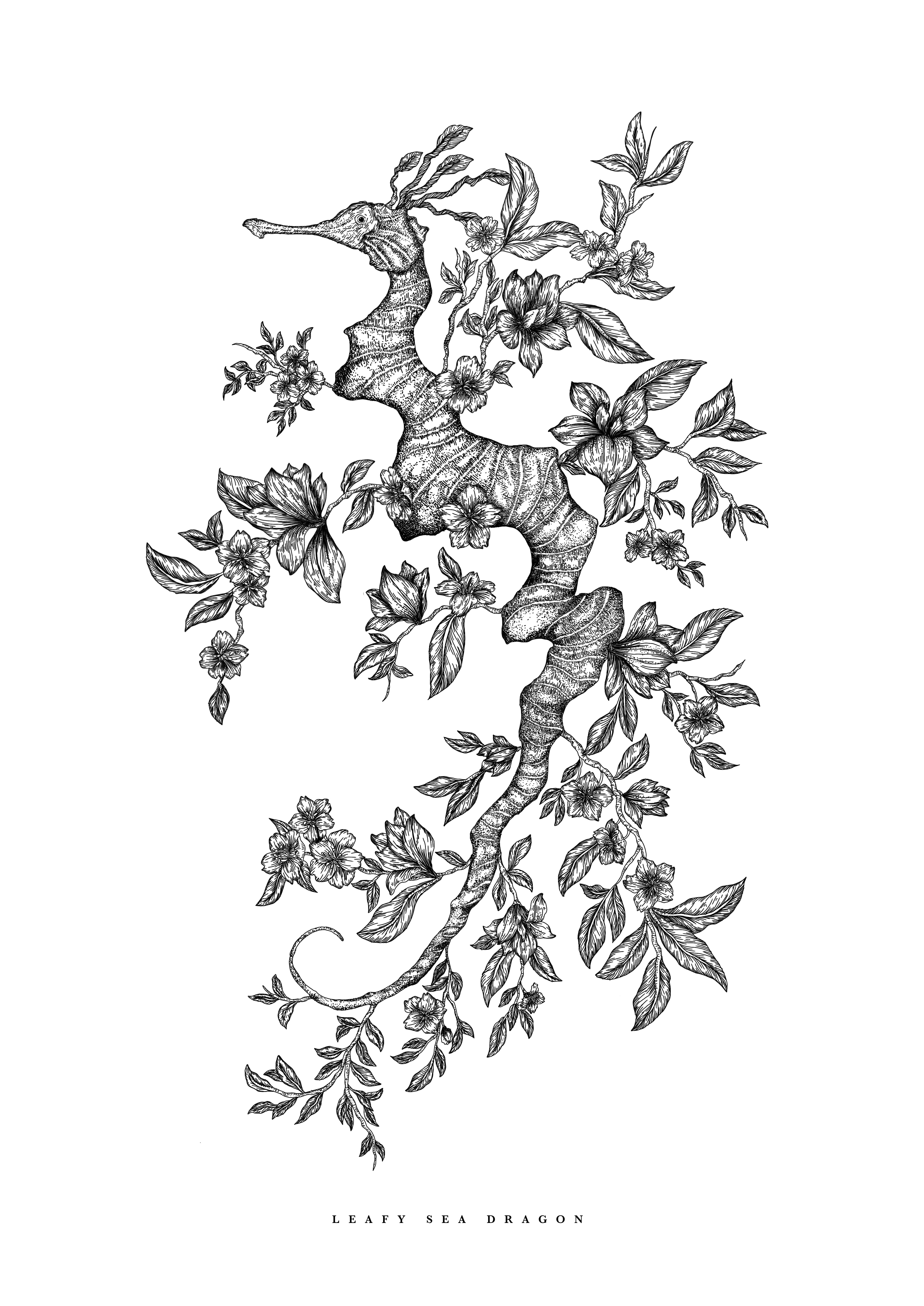 この作品はリーフィーシードラゴンという種類のタツノオトシゴをモチーフに、体の周りに桜と木蓮をあしらって描きました
