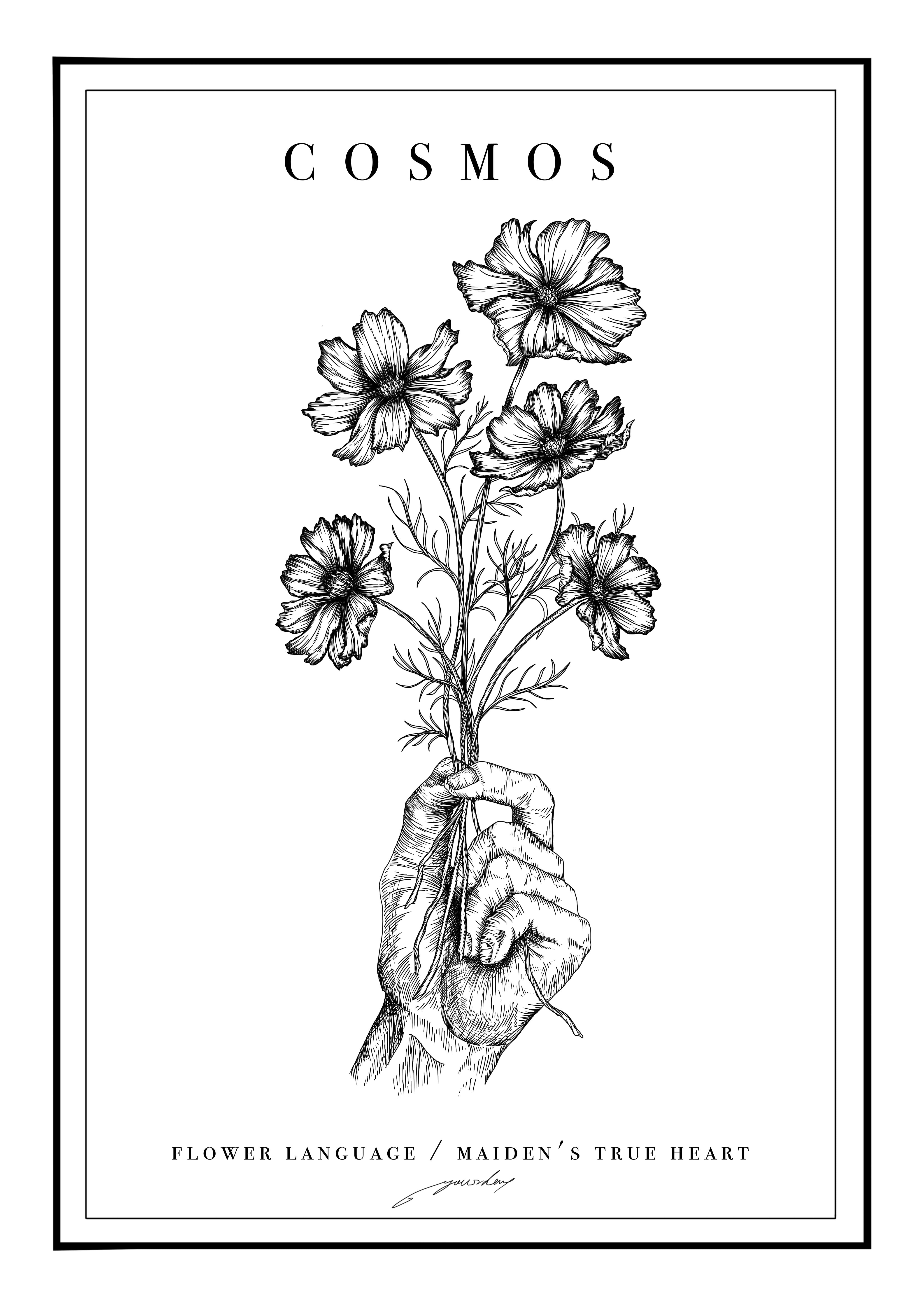 5輪のコスモスのうち一輪だけを握りしめているのは、彼の中で大切にしている1人の女性を思っていることを表現しております。