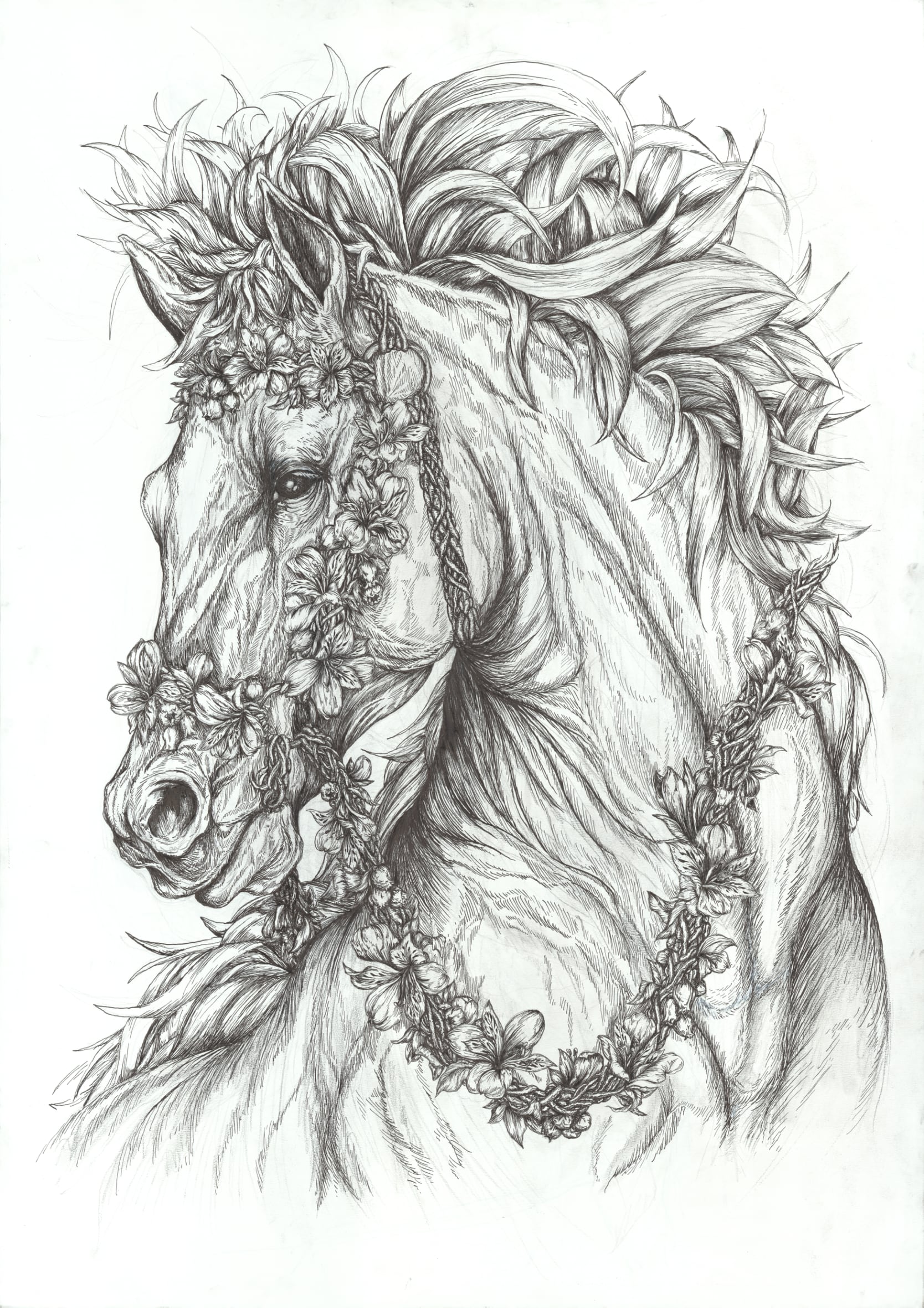 目を悲しみや恐れを感じさせるように描いたのは、目標向かって突き進む中での恐怖を表現したものです。馬はパワーの象徴として捉えていますがその中にちゃんと弱さも併せ持ついかにも人間らしい馬を描けたのではないかと思います。