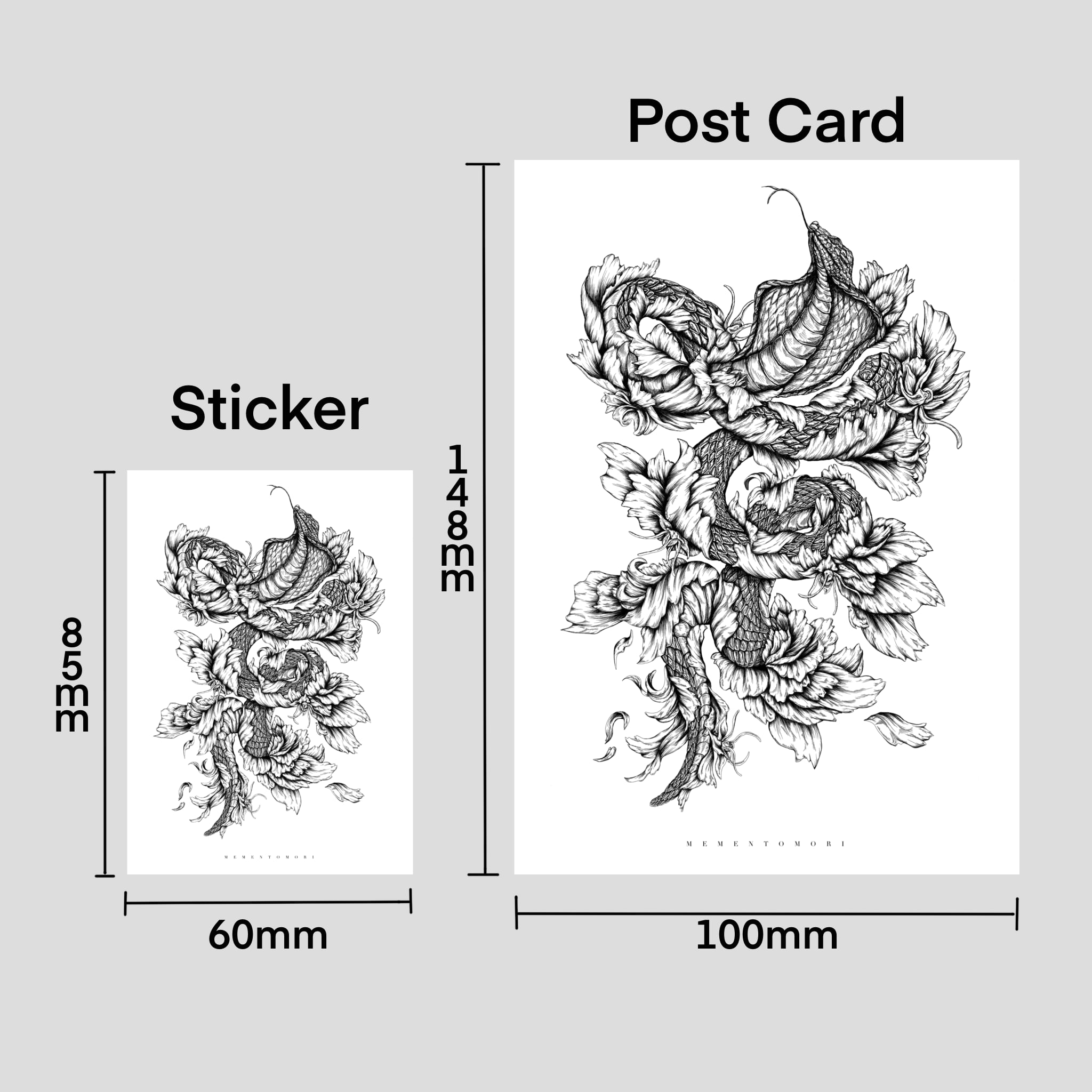 スマホケースにぴったり収まるステッカーと、飾って楽しめるポストカードのセットです。